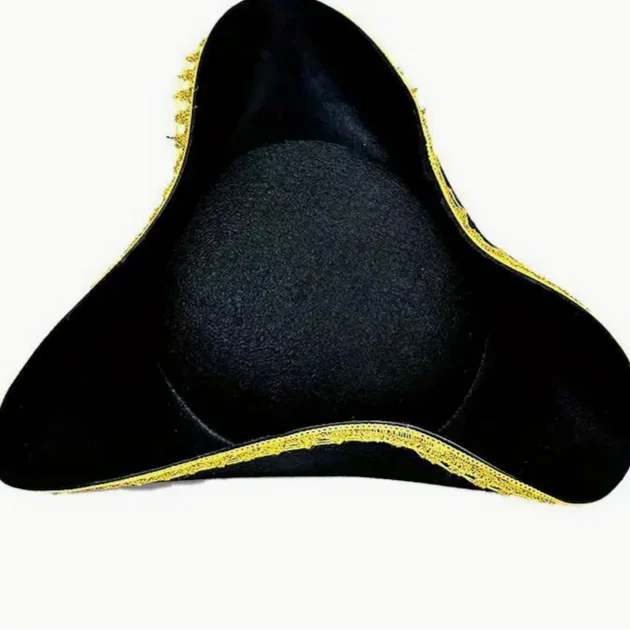 This black tricorne hat is made of felt and trimmed in gold gimp braid. It makes a great soldier, sailor, gentleman or 18th Century Pirate. The sides are kept in place by hidden velcro on each of the three sides. One size.