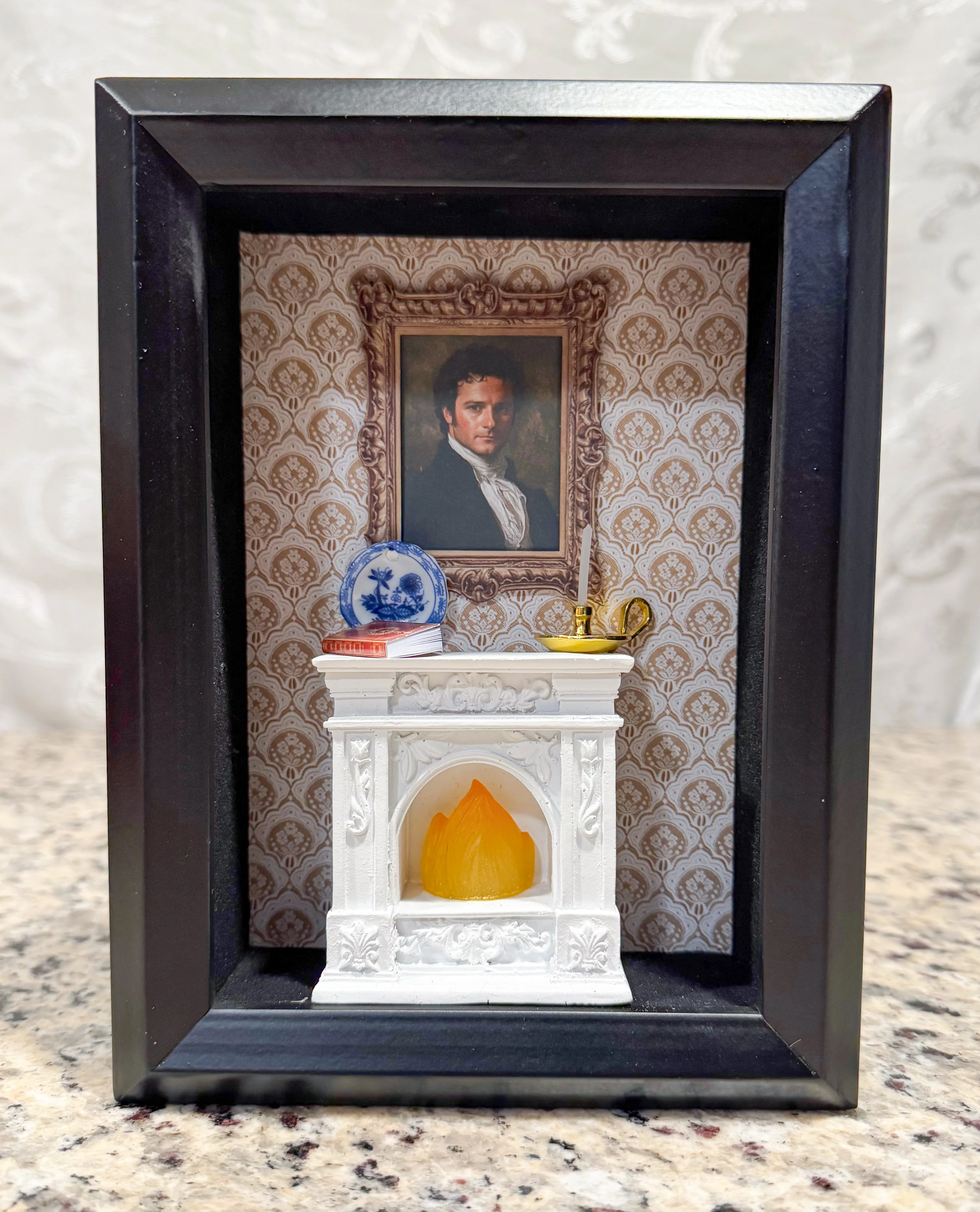 This unique collector box (5.75 x 7.75 x 2.25) pays tribute to Mr. Darcy of Pemberley-featuring an Austentation exclusive portrait of the hero of Pride and Prejudice, imposingly hung over a fireplace- which really turns on for an illuminated effect. These boxes are accented with tiny china plates, metal candlesticks and books with real pages! The detail is exquisite- and I have only a few in stock.